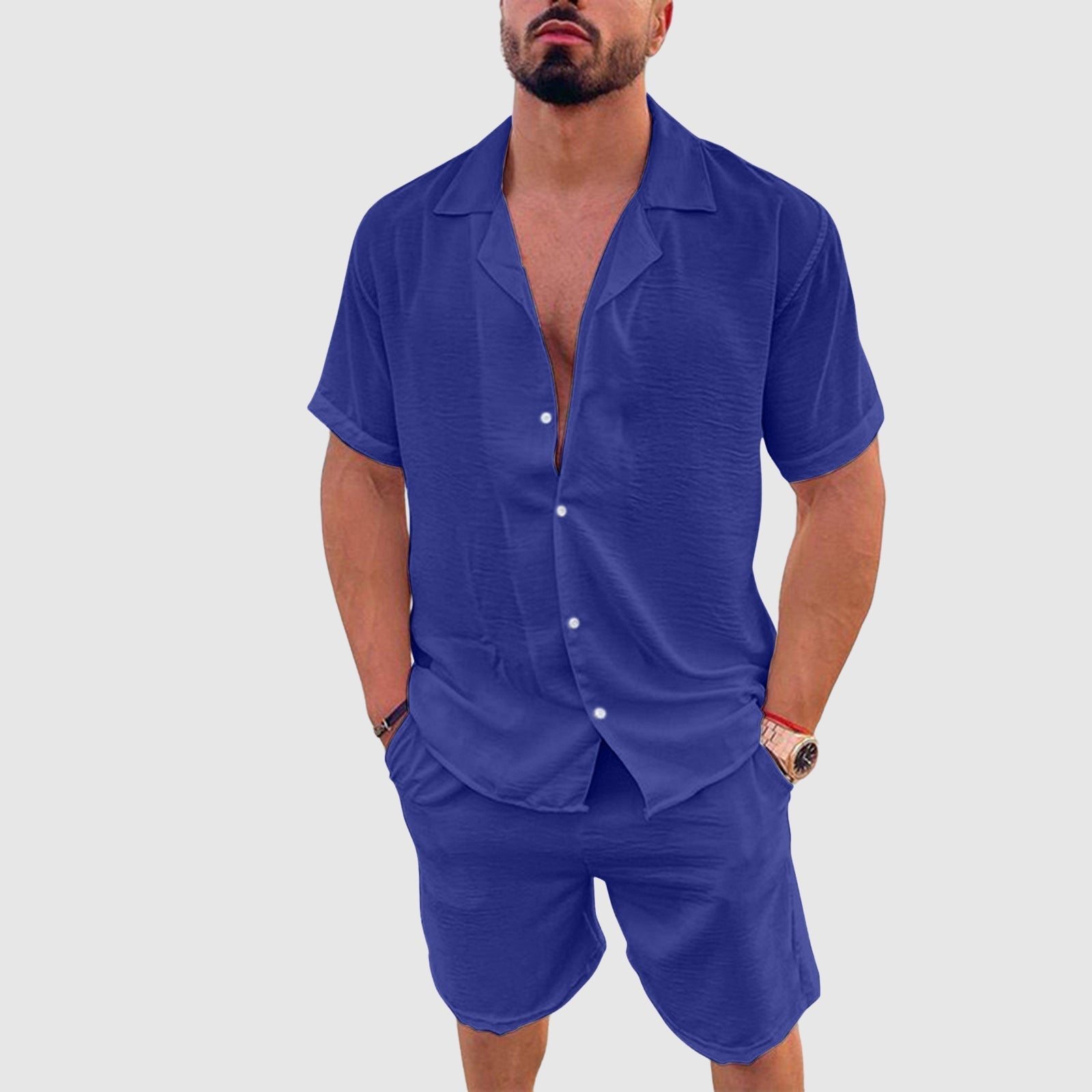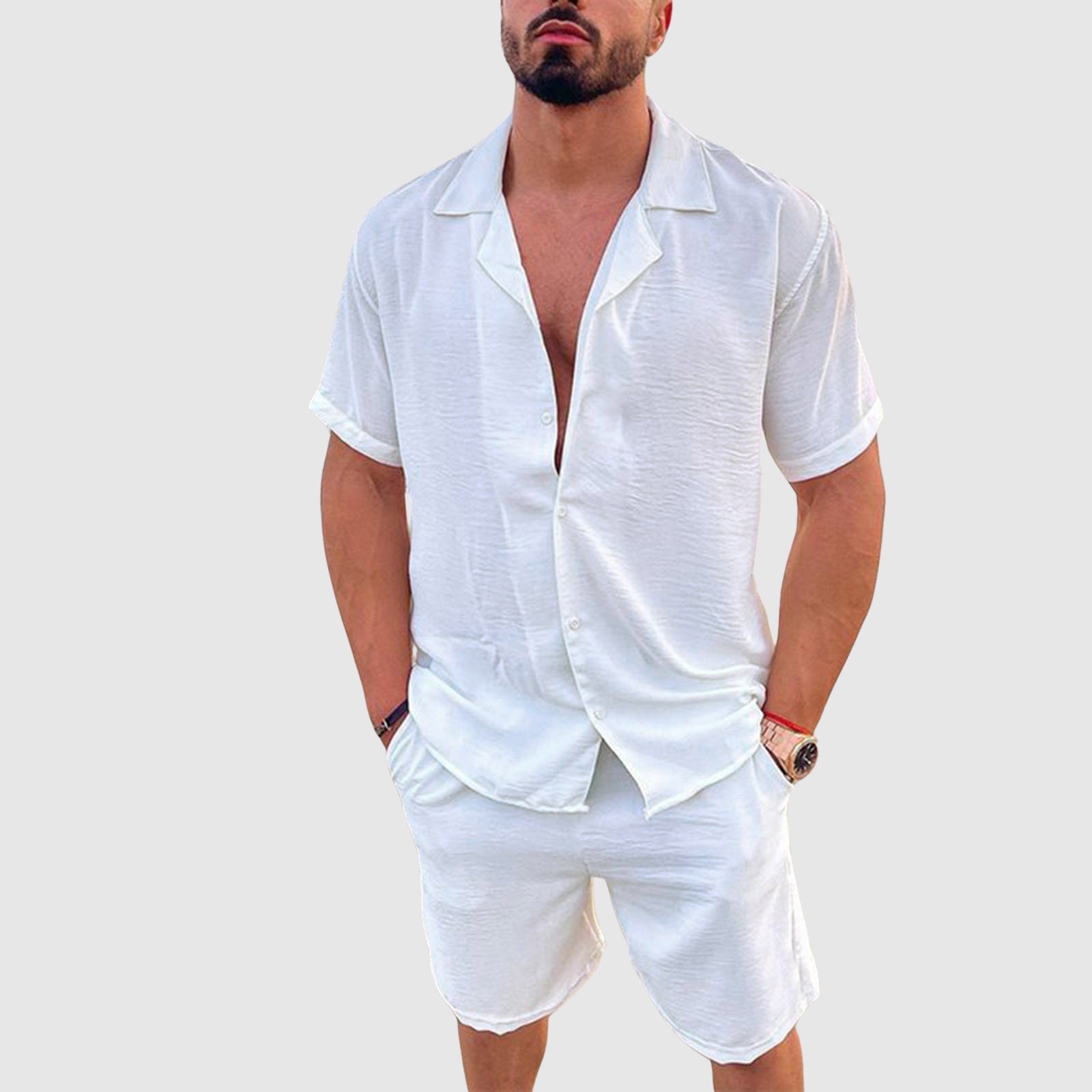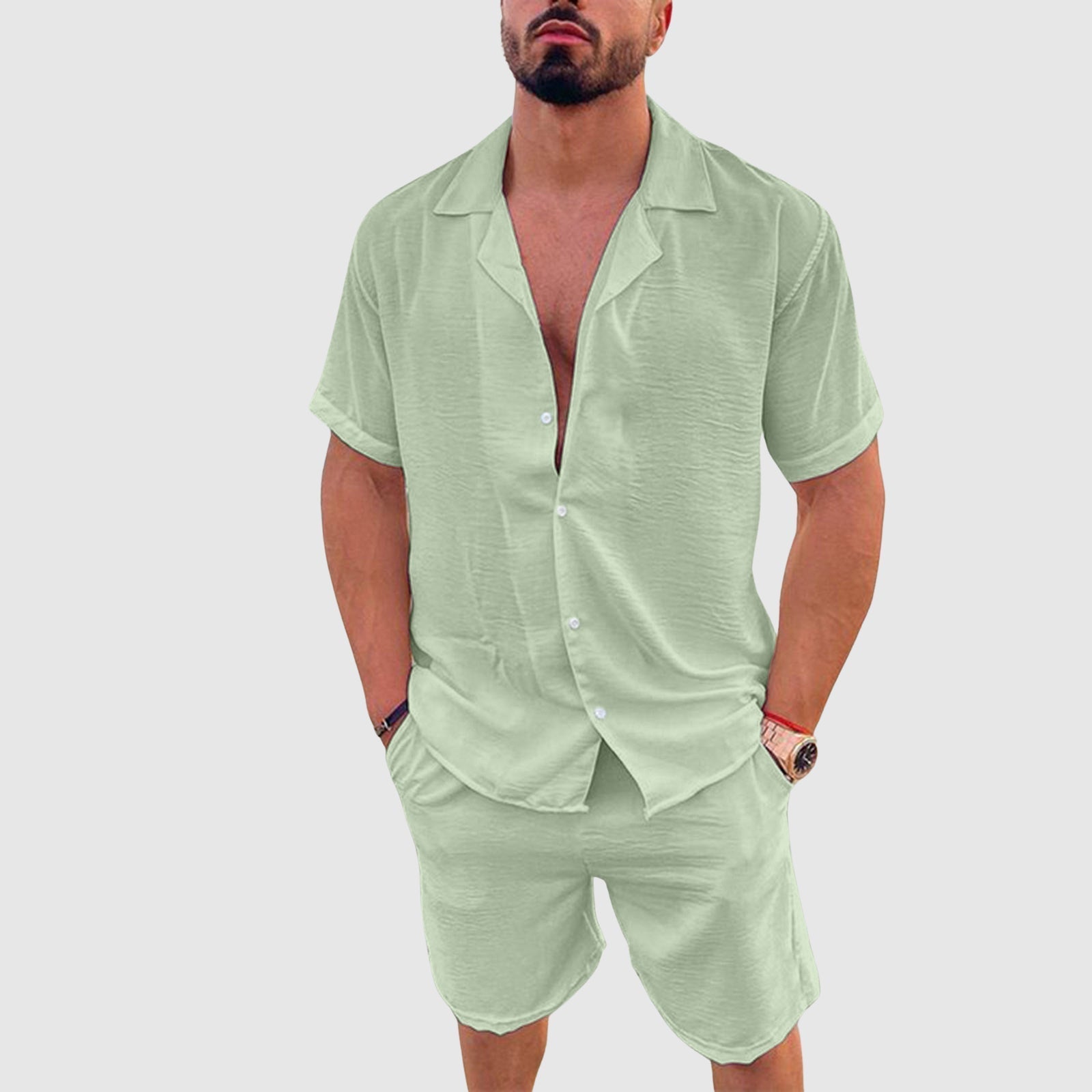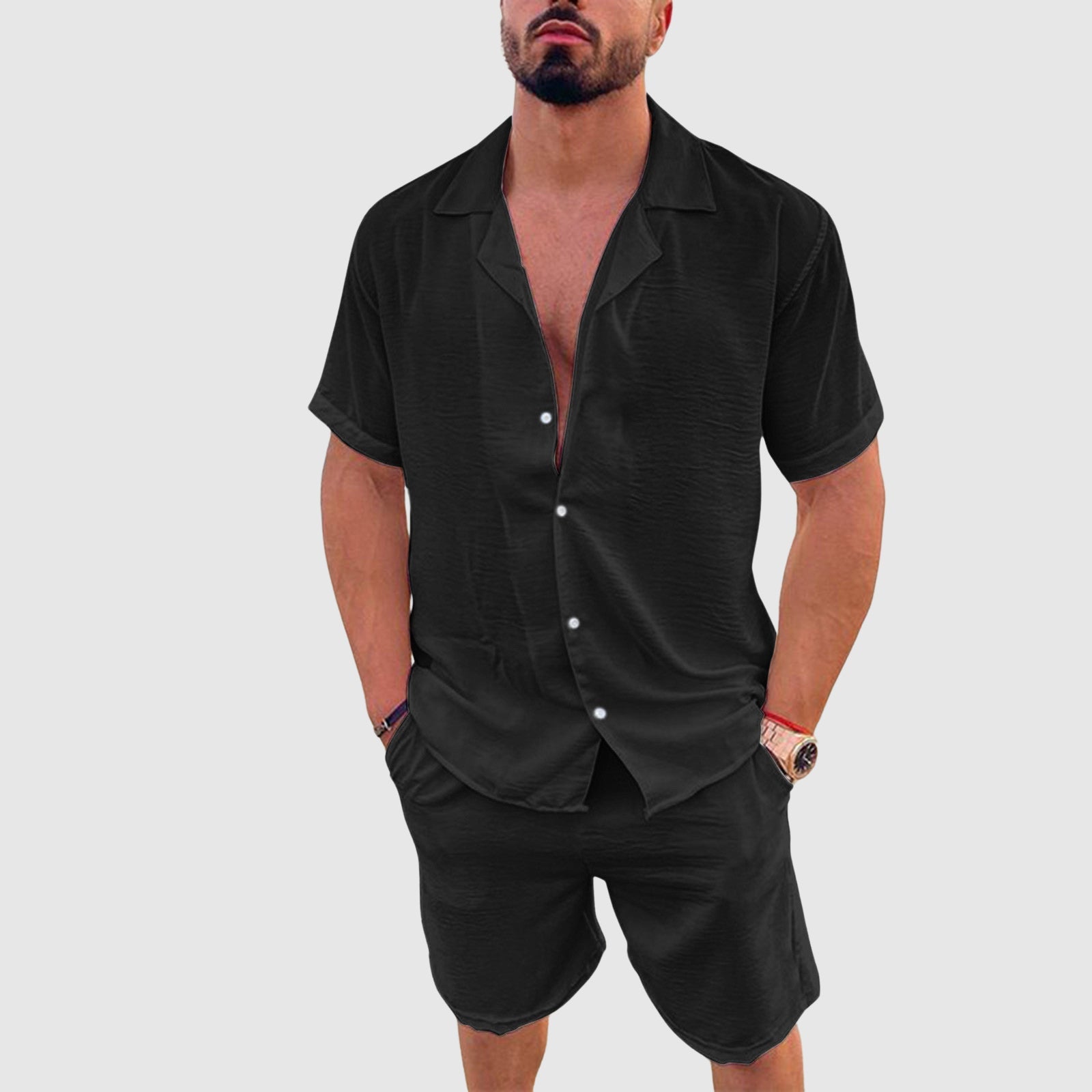 - The set includes a short-sleeved shirt and coordinating shorts with elastic waistband