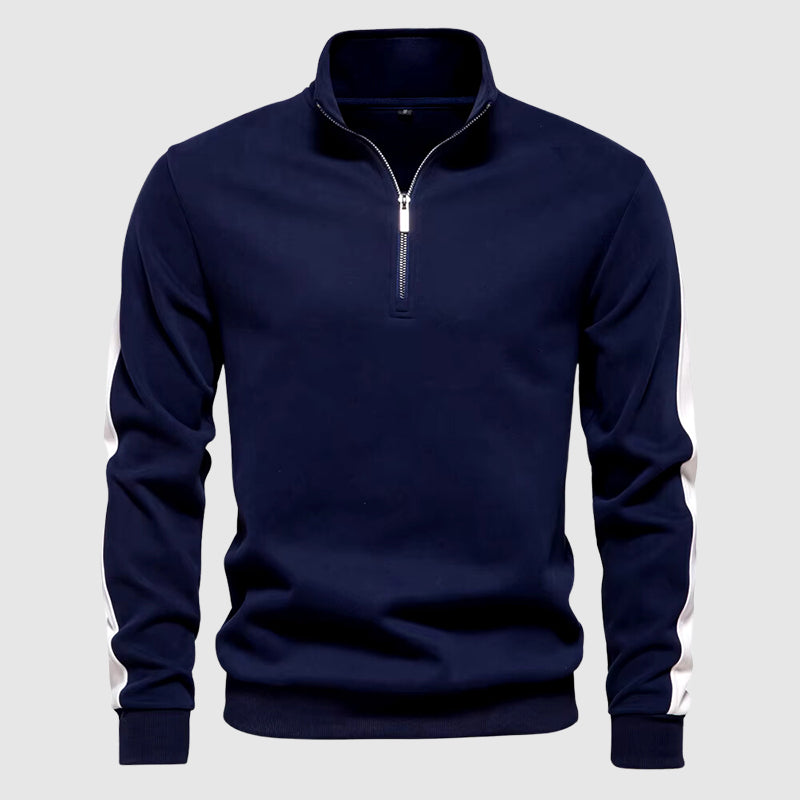 With its sleek half-zip collar and a soft cotton finish, this sweatshirt exudes a minimal yet sporty flair. The contrasting stripes along the sleeves add a touch of modern sophistication, while the ribbed cuffs ensure a snug, comfortable fit.