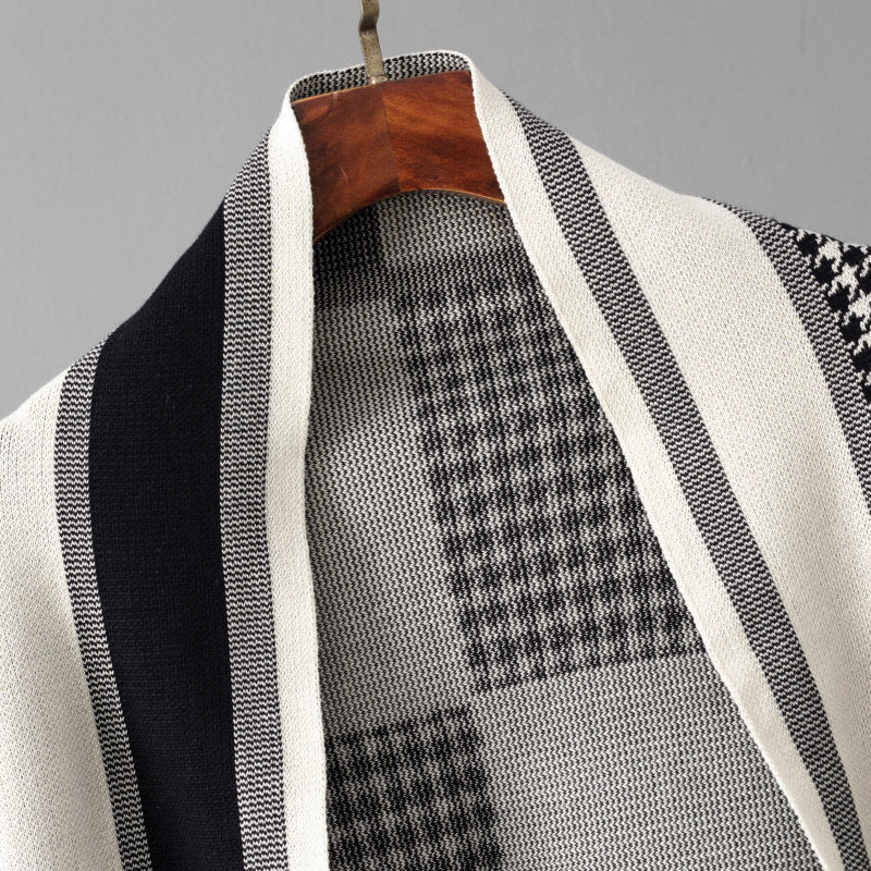 - Open-front cardigan with contrast houndstooth trim
