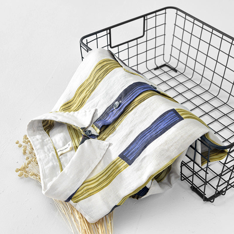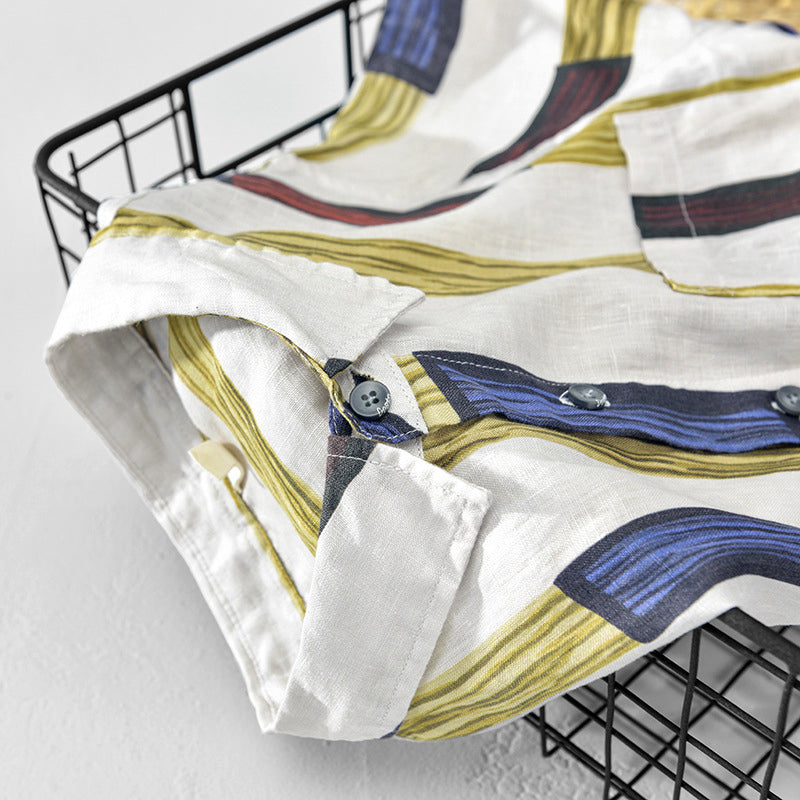 Crafted from breathable linen, this shirt features colorful stripes on a white background, adding a vibrant touch to your look. Complete with a chest pocket for added functionality, it's perfect for both casual and semi-formal occasions.